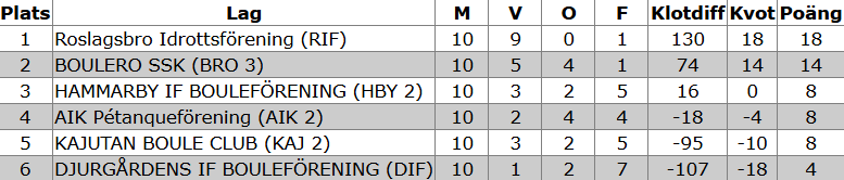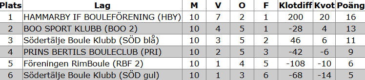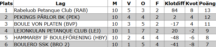 Andra sammandraget gick däremot bättre; oavgjort mot Lejonkulan och Boulero samt vinst mot Boule von Platen och Rabeluob. Tyvärr avslutades helgen med förlust mot Pekings pärlor så vi landade på en femte plats och kommer därmed spela i division 3 i seriespelet 2026.